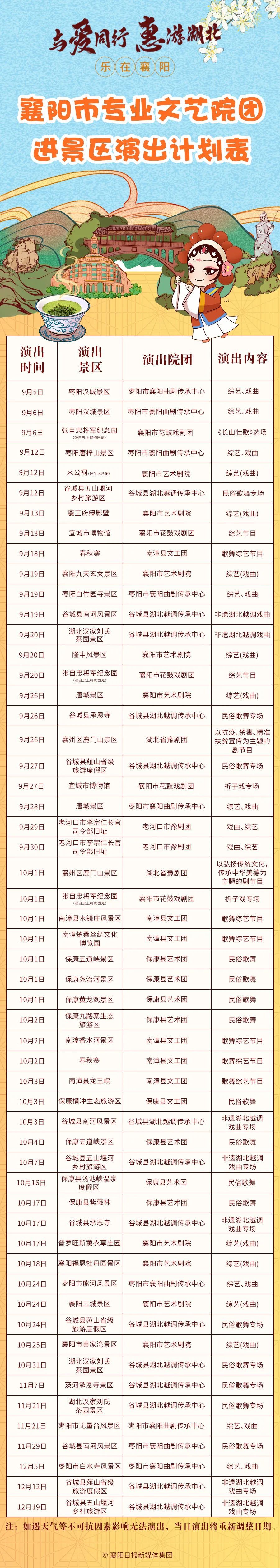 首场演出将于9月5日在枣阳市汉城景区上演,活动期间,襄阳市文化和旅游局组织全市专业文艺剧团将陆续走进襄阳市A级景区,开展55场景区演出活动。