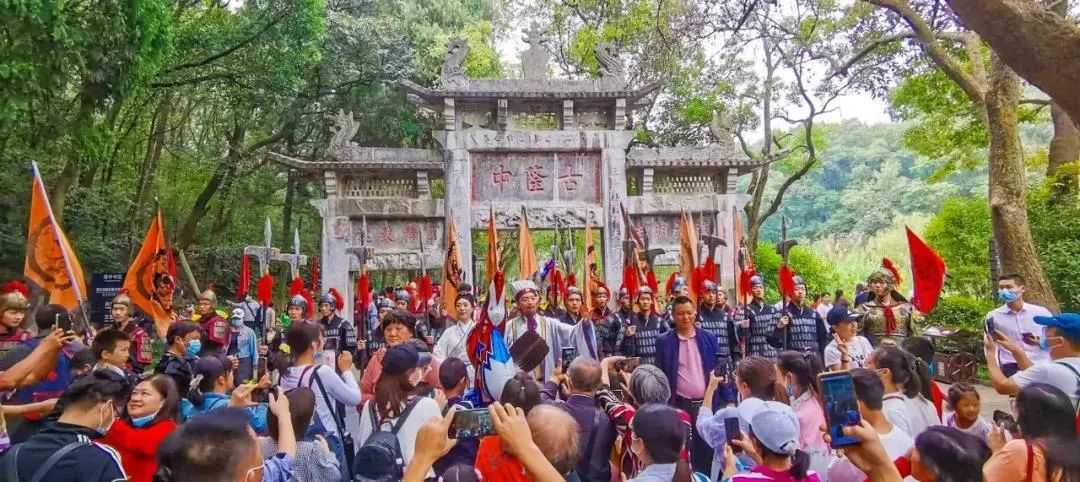 ▲隆中景区石牌坊前精彩绝伦的迎宾演出,吸引游客驻足观看