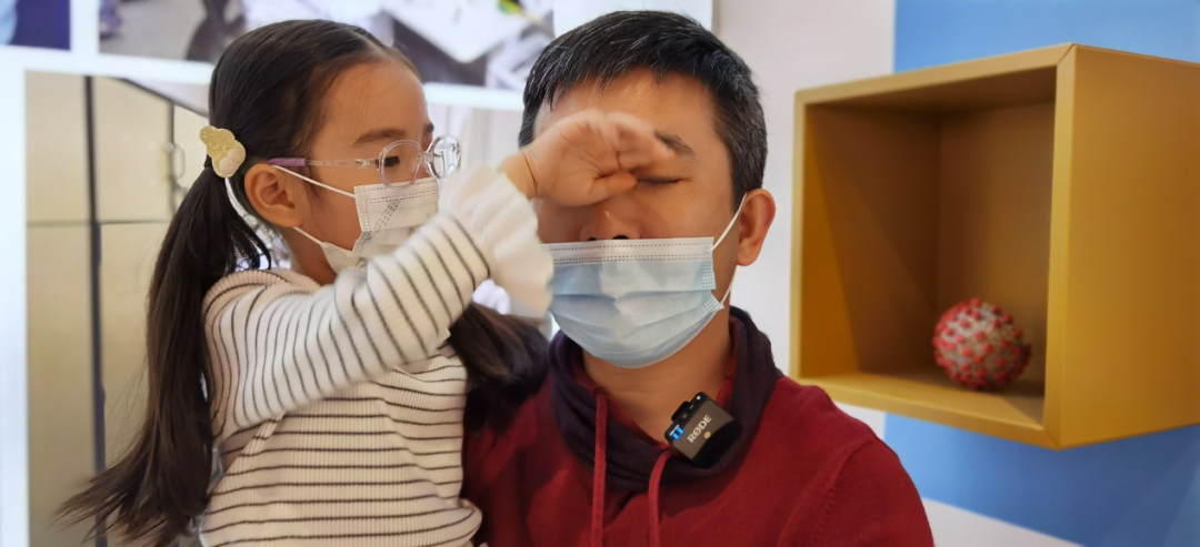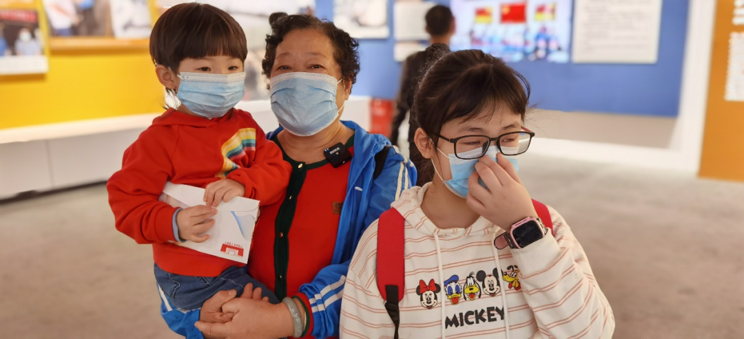 贵州省第二批援鄂医疗队护士长杨帅君,携妈妈、女儿、爱人及队友王丽前来观展。其大女儿在展览现场看到妈妈工作过的复原场景,痛哭流泪。