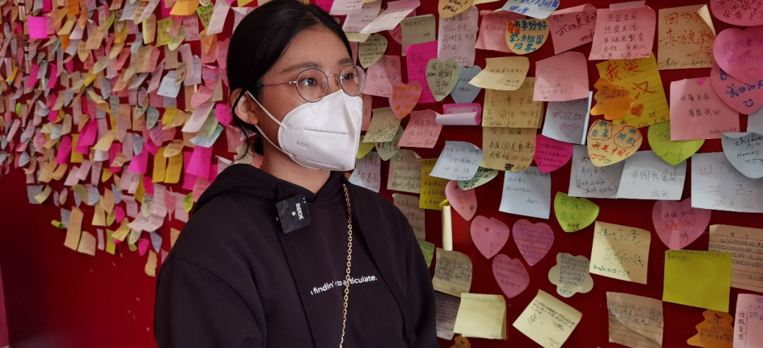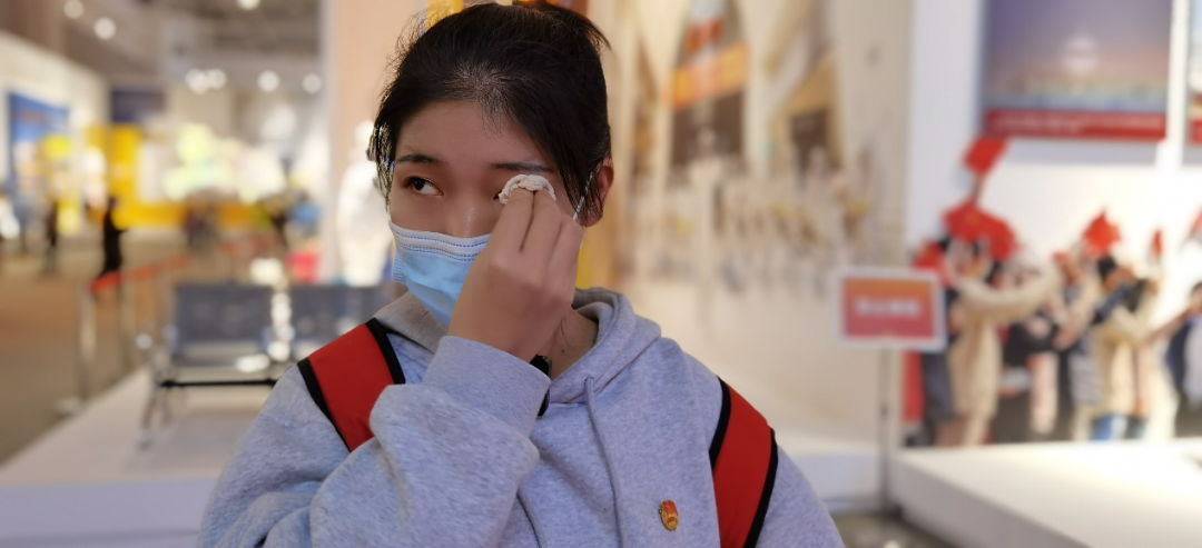孙向未,来自山东日照市,留学韩国延世大学,飞回国内在武汉隔离,解除隔离第二天,来到展览,留下眼泪。