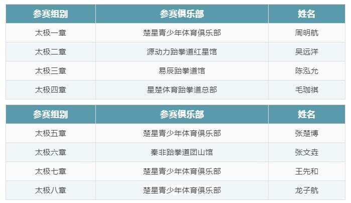 2020年“百千万”襄阳市全民健身赛事活动——首届跆拳道网络视频大赛各组别第一名如下:
