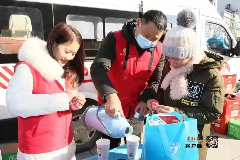 经过检验检测、符合参加无偿献血条件的志愿者,有序在献血车上参加献血活动。其他的志愿者向路人分发宣传无偿献血相关知识的宣传册。