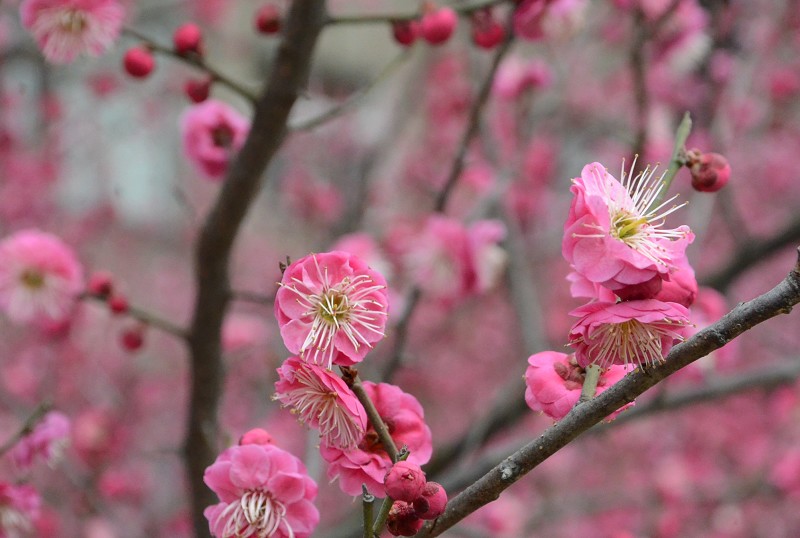 在这里,梅花与蜡梅开出了排面,开出了气势,开出了艳丽的色彩。红的、黄的、绿的萼,被树的铮铮铁骨支撑起来,蓬勃向上,给人以振奋之感。
