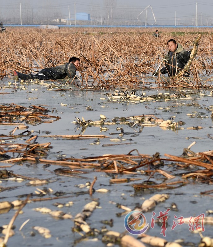 1月15日,在牛首镇张湖村,农民正在藕塘里采冬藕。据了解,牛首镇张湖村种藕面积达1500余亩,年产量达350多万斤。全媒体记者李旭晖 江旭东 通讯员赵杰摄
