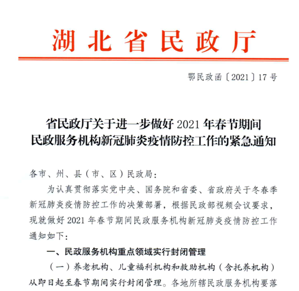 汉江网讯【通讯员张平 全媒体记者徐勇】21日,记者从市民政局获悉,接省民政厅紧急通知,从20日至春节期间,我市养老机构、儿童福利机构、救助机构(含托养机构)实施封闭管理。