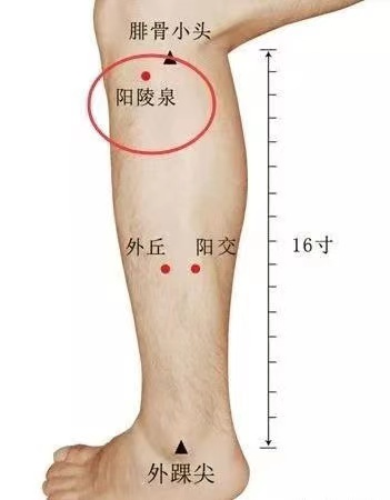 阳陵泉:在小腿外侧,当腓骨头前下方凹陷处。该穴位主治:半身不遂,下肢痿痹,麻木,膝膑肿痛,脚气,胁肋痛, 口苦,呕吐,黄疸,小儿惊风。