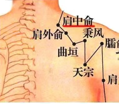 肩中俞:在背部,在第7颈椎棘突下,旁开2寸。该穴位主治:咳嗽,气喘,唾血,项强,肩背疼痛等。