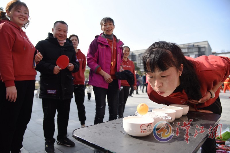 3月4日,市民在仲宣楼广场进行趣味活动。在妇女节来临之际,襄城绿影壁社区组织辖区居民开展以“激扬巾帼志,建功新时代”为主题的庆“三八”系列活动,通过“双人绑腿30米齐步走”“吹蜡烛比赛”“巧吹乒乓球过河”等趣味活动,丰富社区居民的生活。全媒体记者 江旭东 通讯员 李艳莉 张艳敏 摄