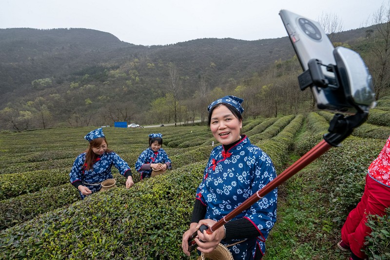 3月20日,保康县官山茶场工作人员直播采茶。随着天气转暖,全县16.7万亩生态茶园全面开园,进入春茶采摘黄金期。该县多家茶企积极与电商平台对接,通过直播的方式帮助茶农增收致富。特约通讯员 陈泉霖通讯员 陈先瑞 摄