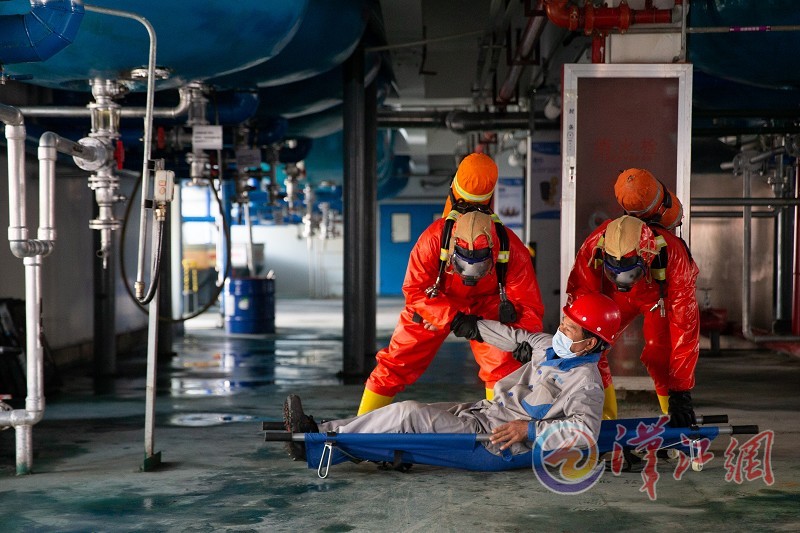 3月25日,在湖北凌晟药业有限公司,凌晟药业工艺处置专业队队员在演练中救援伤员。当日,2021年襄城区第一季度化工企业工艺处置专业队应急处置拉练在湖北凌晟药业有限公司举行。