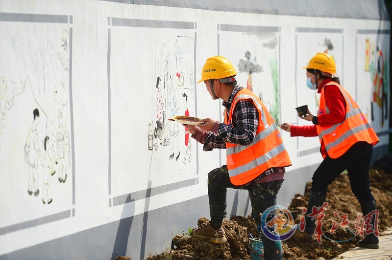 3月24日,在团山镇李冲村,中铁上海工程局施工人员用彩绘美化民房外墙。该村在美丽乡村建设过程中,除了对基础设施进行升级改造之外,还着力改善人居环境、村容村貌,通过墙体彩绘提高“颜值”。 全媒体记者谢勇 通讯员李健摄