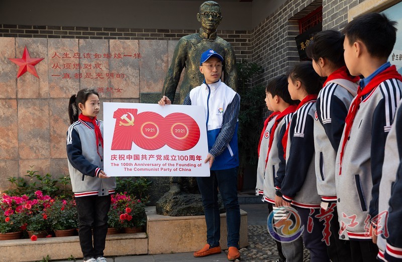 3月25日,在位于昭明小学的萧楚女纪念馆,襄城区古城街道志愿者向学生们介绍中国共产党成立100周年庆祝活动标识。