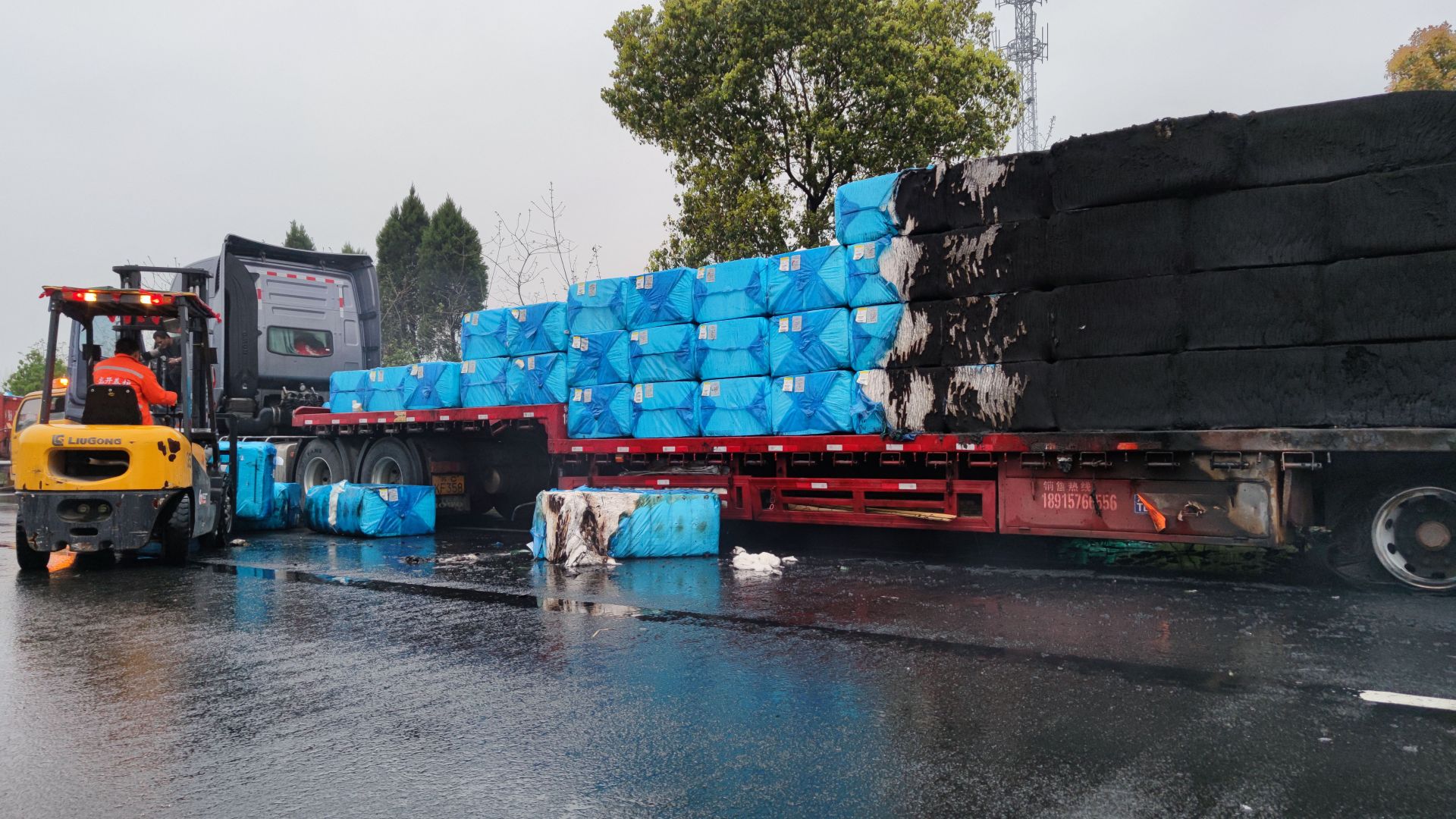 汉江路消防救援站到达现场后,立即为琵琶山路消防救援站消防车供水,16时20分明火基本扑灭。随后,琵琶山路消防救援站对存在阴燃迹象的部位进行清理,同时帮助司机转运棉花货物。