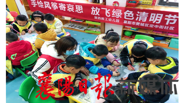 4月1日上午,樊西教工幼儿园联合樊城定中街社区志愿者和幼儿们一起用风筝作画,将青团、革命烈士纪念碑、思念寄语、经典诗句等清明节元素融入其中,以这种独特的缅怀方式传承民俗文化,倡导文明祭祀绿色清明。