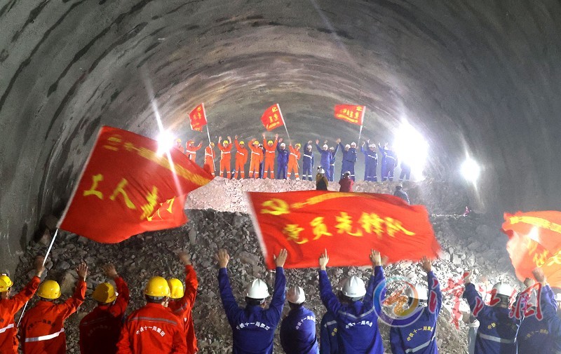 4月12日,中铁十一局建设者在郑万高铁高家坪隧道庆祝贯通。