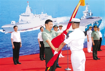4月23日,海军三型主战舰艇——长征18号艇、大连舰、海南舰在海南三亚某军港集中交接入列。中共中央总书记、国家主席、中央军委主席习近平出席交接入列活动并登上舰艇视察。这是习近平向大连舰授予军旗、命名证书。