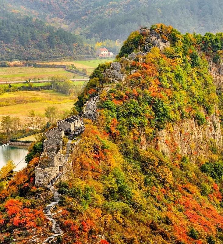 山寨之上,150多间石屋鳞次栉比,很是壮观,从空中俯瞰,整座春秋寨宛如山顶之上的长城,蜿蜒巍峨。春夏苍翠,秋冬灿烂,春秋寨四时风景皆不同,但晚秋时的层林尽染,更显悠悠千载岁月沉淀的壮美魅力。