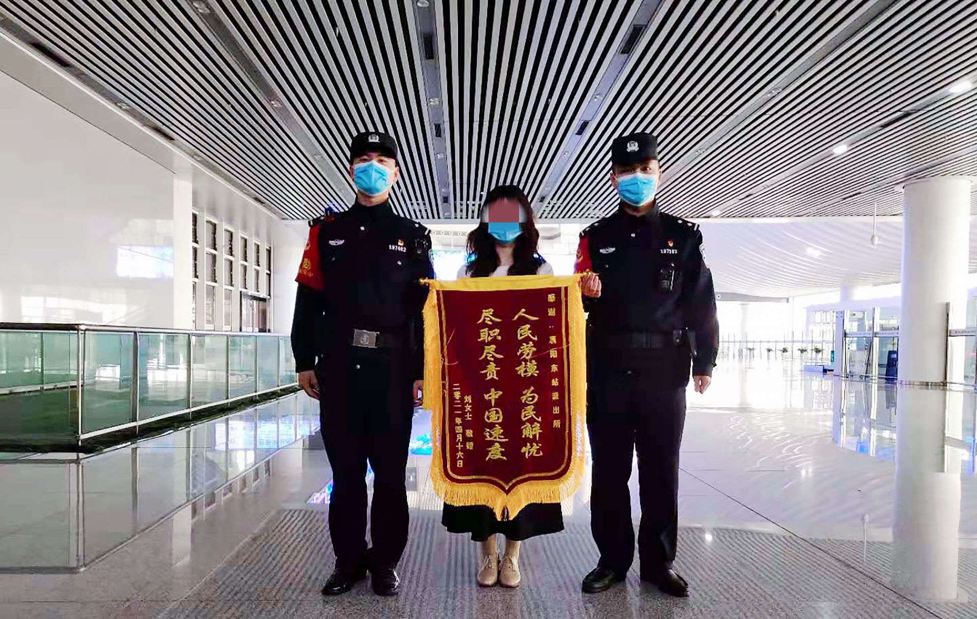 拿到失而复得的手机时,刘女士激动地连声感谢,并将一面印有“人民劳模,为民解忧,尽职尽责,中国速度”的锦旗送到民警手中,对襄阳东车站派出所警务人员尽职尽责、一心为民全力维护群众利益表示感谢。