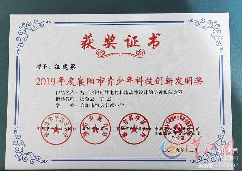 伍建梁很快就发现这个简易的防近视装置存在许多问题:一是护眼灯太高,不方便携带;二是瓦楞纸容易变形,且极易受潮,影响水银控制器的角度传感。伍建梁又思考、试验、改进。伍建梁最终制成的阅读器在使用的时候,可以自动开启护眼灯补光,并且能够自动关闭不需要的灯,既方便又节约能源。2019年12月30日,他制作的“基于水银可导电性和流动性设计的防近视阅读器”,荣获2019年度襄阳市青少年科技创新发明奖;2020年12月4日,国家知识产权局向伍建梁颁发了实用新型专利证书。