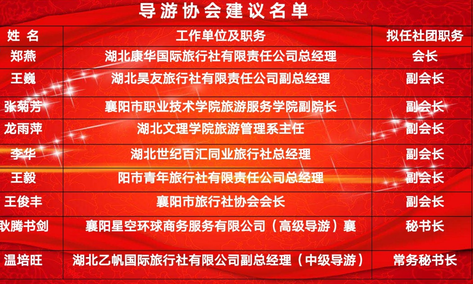 会议审议通过了《襄阳市导游协会章程》,选举产生了襄阳市导游协会第一届理事会9名理事成员,选举产生了1名会长,6名副会长,1名秘书长,1名常务秘书长。
