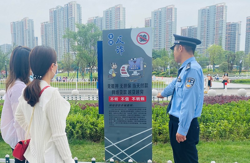 5月18日,团山派出所民警正在向路过的市民讲解反诈宣传牌上发生在本辖区的案例。