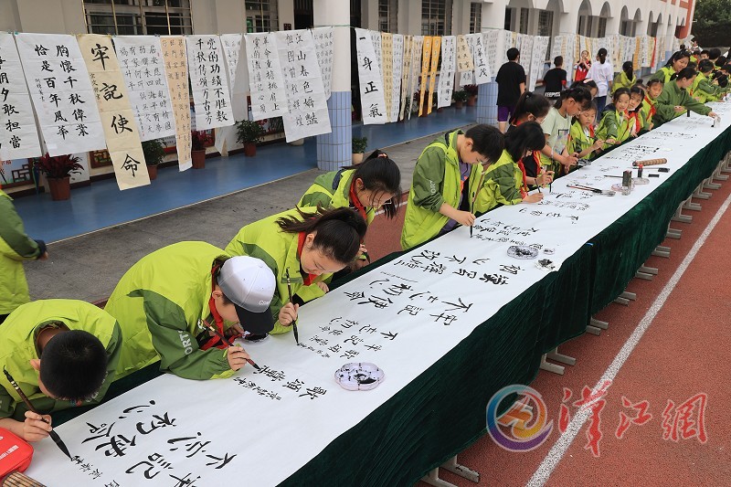 5月20日,樊城区“书法进校园”暨第八届“翰墨颂党恩,丹青绘百年”书画大赛在米公小学举行。小学生们在百米长卷上认真书写、绘画,抒发对党和国家的热爱之情。