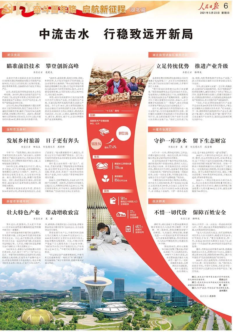 本报记者 贺广华 范昊天在经受一场艰苦卓绝的历史大考后,英雄的湖北人民将伟大抗疫精神转化为砥砺前行的强大动力,以思想破冰引领发展突围,以干在实处推进走在前列,消费投资全面回暖,社会民生持续改善,今年一季度,全省地区生产总值9872.67亿元,比去年同期增长58.3%。“一主引领、两翼驱动、全域协同”,全力推进区域发展“十四五”开局之年,湖北区域协调发展全面破题:4月21日,武汉城市圈9地签署“1+8”城市跨市通办合作协议;5月14日,襄阳、十堰、随州和神农架林区的27个县市区行政审批部门签订异地通办协议……紧扣一体化和高质量发展要求,2020年12月,湖北省委十一届八次全会科学绘制全省未来发展蓝图,提出着力构建“一主引领、两翼驱动、全域协同”的区域发展布局。武汉,既要一马当先打造中部崛起“高地”,也要扛起“一主引领”区域发展重大责任。从“一城”到“一圈”,武汉主动担当作为:今年1月,武汉地铁11号线三期延伸到鄂州市葛店开发区;2月,全长560公里的武汉城市圈环线高速公路全线通车,相邻城市实现半小时通达;5月,集通达黄石、黄冈、咸宁的三条城际铁路以及快速公交、地铁于一体的武汉东站已初具规模。随着武汉城市圈产业配套、政务服务、交通物流等水平不断提升,鄂州、黄石、咸宁等地纷纷加快发展与武汉配套的新型显示模组、印制电路板等高新产业。“两翼”之襄阳、宜昌两个省域副中心城市敞开胸怀,致力推动“襄十随神”“宜荆荆恩”城市群由点轴式向扇面型发展。“全域协同发展,差距在县域、潜力在县域、关键在县域。”4月,湖北召开全省区域发展布局暨县域经济推进会,省委书记应勇提出加快补齐县域经济和农业产业化发展短板。“十三五”期间,湖北各县市努力“做实”中心城镇,“做优”乡村振兴,县域经济总量突破2.5万亿元,占全省经济总量的一半以上。抓好科技创新硬支撑,提升营商环境软实力“五一”假期期间,中国光谷科技创新成果光影展在武汉精彩上演。其中,一台来自华工科技产业股份有限公司的激光切割机广受关注。“我们历经十年‘产学研用’攻关,研发出国内首套三维五轴激光切割机,核心部件国产化率达90%,可满足汽车、航空航天等高端制造需求,目前产品市场占有率全国第一。”华工科技董事长马新强说。以“光芯屏端网”万亿级产业集群为引领的武汉,充分发挥自身科教优势,以重大创新平台为支撑,瞄准基础研究原始创新的“最先一公里”,致力打通科技成果转化“最后一公里”,正加快发展新一代信息技术、航空航天、海洋装备等新兴产业。湖北高标准建设光谷科创大走廊,以武汉东湖高新区为中心的数字经济、智能经济和总部经济三条千亿创新产业带,向着鄂州、黄石、黄冈等地拓展。紧邻武汉光谷的鄂州葛店开发区,率先尝到甜头,全区规模以上工业企业,直接为武汉配套的占到1/4。同时,湖北着力优化营商环境。2020年6月,湖北印发“十必须十不准”通知,明确要求各地各部门及工作人员当好“有呼必应、无事不扰”的“店小二”。日前,在当阳市政务服务大厅“一事联办”窗口,办事人员杨帆很快为公司办好了劳务派遣经营许可证,“以前要一两周,现在仅需40分钟。”今年3月,当阳市推出“当办好”小程序,整合若干服务端口,53个证明事项实行告知承诺制,224个事项推行“一诺办”。今年1月至4月,湖北全省办理涉及“证照分离”改革事项业务93万多件,惠及市场主体53万多户。巩固脱贫攻坚成果,有效衔接乡村振兴“多亏党的好政策,才能有今天的好日子。”鸡刚打鸣,黄冈市红安县七里坪镇杨山村的王晖红就麻溜地起床,直奔鸡窝猪圈,喂鸡喂猪、打理蜂房,日子过得美滋滋。46岁的王晖红曾一度因治病欠债陷入贫困,2015年被纳入建档立卡贫困户,搬进了易地搬迁安置点的新家。受益于产业扶贫政策,王晖红成了特色养殖大户。去年遭遇疫情,各级干部及时施以援手,再一次帮助他渡过了难关。党的十八大以来,湖北尽锐出战、不胜不休,攻克一个又一个“贫困堡垒”——581万建档立卡贫困人口全部脱贫,37个贫困县全部摘帽,4821个贫困村全部出列!疫情防控形势好转后,湖北统筹做好疫情防控和脱贫攻坚工作,迅速开通“点对点”务工专列。2020年,全省贫困劳动力外出务工超200万人,同比增长7.8%。对于滞销的荆楚扶贫农产品,举国上下积极“搭把手、拉一把”。脱贫摘帽不是终点。湖北巩固脱贫攻坚成果,有效衔接乡村振兴,致力以农业农村现代化抬高全省高质量发展的底板。据不完全统计,全省37个脱贫县已形成54个扶贫主导产业、2060家龙头企业,初步实现了“村村有扶贫产业、户户有致富门路”。抚今追昔守初心,鉴往知来担使命。湖北省委始终牢记习近平总书记对湖北作出的一系列重要指示,正满怀信心带领全省人民努力把湖北建设成为中部地区崛起重要战略支点,争取在转变经济发展方式上走在全国前列,奋力谱写新时代湖北高质量发展新篇章。