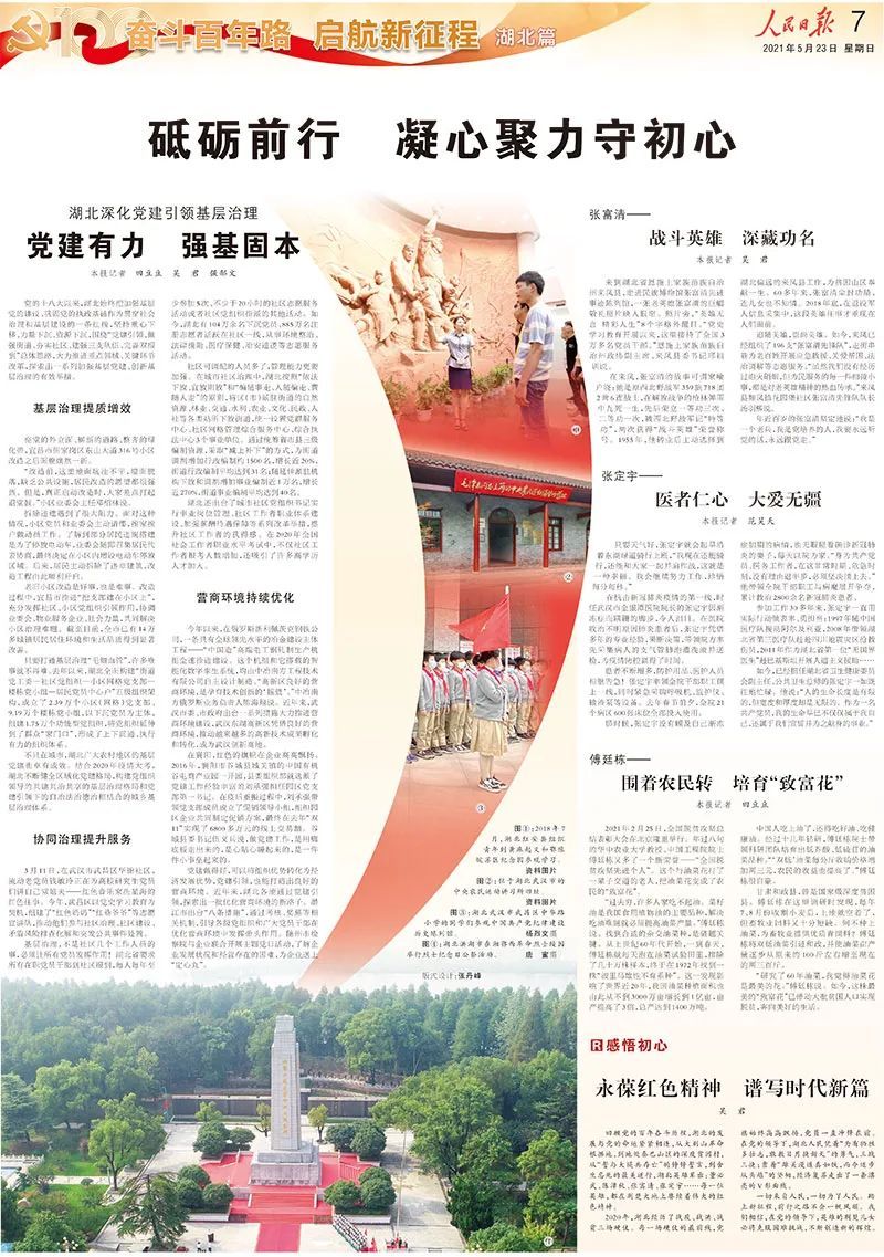 回顾党的百年奋斗历程,湖北的发展与党的命运紧紧相连,从大别山革命根据地,到地处秦巴山区的深度贫困村,从“誓与大堤共存亡”的铮铮誓言,到舍生忘死的最美逆行,湖北英雄辈出:董必武、陈潭秋、张富清、张定宇……每一位英雄,都在荆楚大地上赓续着伟大的红色精神。