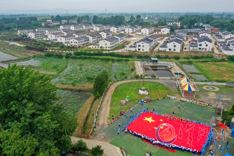 5月22日,家长带着孩子在襄城区尹集乡姚庵村荷花湖参加巨幅国旗传递活动。姚庵村将爱国主义教育融入乡村旅游活动,让游客在欣赏美丽乡村风景的同时,受到爱国主义精神的熏陶和感染。