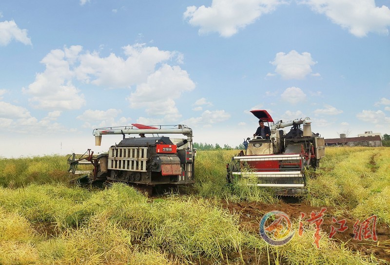 又到夏收时节,5月18日,在龙王镇闫营村千亩油菜种植基地里,趁着晴好天气,农机手们驾驶分段式联合收割机抢收成熟的油菜,呈现出一派喜人的丰收景象。 通讯员 张俊华 摄