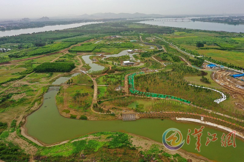 5月24日拍摄的鱼梁洲中央生态公园建设现场。据了解,鱼梁洲中央生态公园一期汉水文化珠链区的建设内容主要包括水系开挖、堆丘造型、乔灌木种植以及桥梁、驿站、园路施工,目前一期建设已经完成75%,计划在今年7月整体完工。全媒体记者 杨东 摄