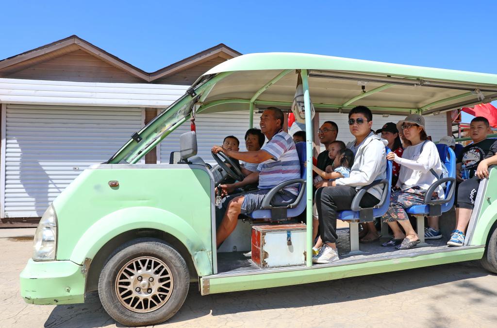 在西柏坡,村民驾驶电动车带领乘客观光游览(2019年8月16日摄)。新华社记者杨世尧摄