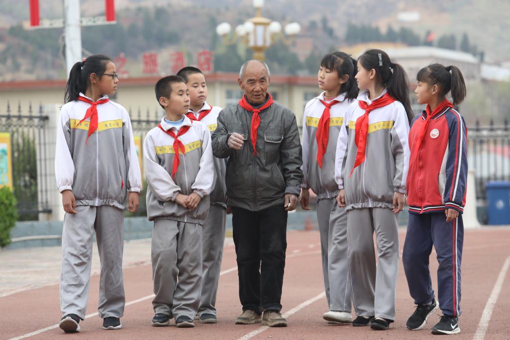 闫青海(中)给孩子们讲奋斗创业的故事(2019年4月8日摄)。新华社发