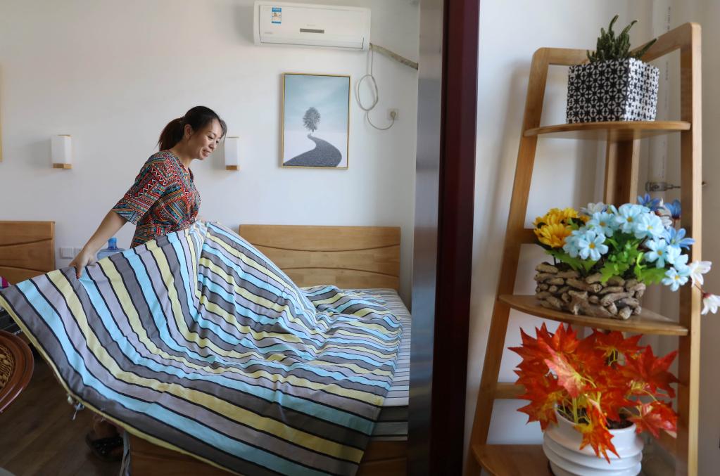 西柏坡镇梁家沟村村民在民宿内整理客房(2019年8月16日摄)。新华社发