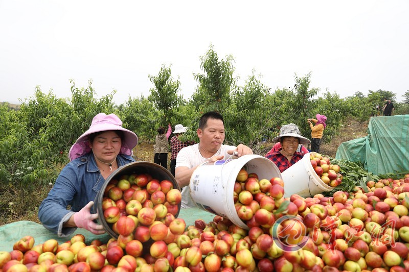 5月27日,在板桥店镇上湾村一处百亩果园内,20多名工人正在忙碌采摘转运,一片繁忙的丰收景象。近年来,板桥店镇因地制宜发展鲜桃种植产业,提升林果质量。目前,全镇鲜桃种植面积近5万亩,其中高品质桃园近1万亩,当地农民走出了一条生态富民路。 通讯员 刘毅 钟军 刘辉 摄