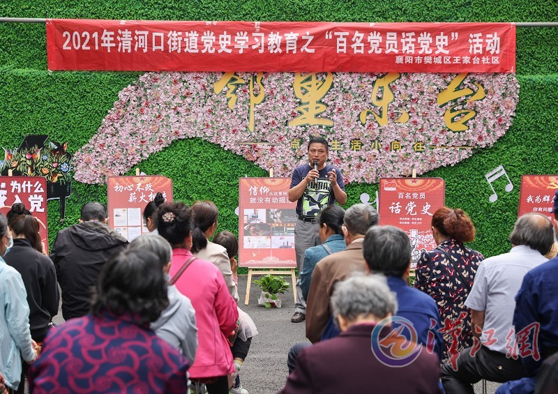 近日,樊城区清河口街道办事处开展“百名党员话党史 红色教育进小区”活动。该街道在辖区选拔100名党史宣讲员,进行党史知识培训后,党史宣讲员深入辖区8个社区100个小区的文化广场、“居民舞台”、“红色驿站”等地,为居民讲党史。通讯员 张沛 刘文文 摄
