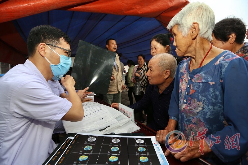 6月18日,襄阳市中心医院的党员志愿者在谷城县南河镇九里坪村为村民进行义诊。