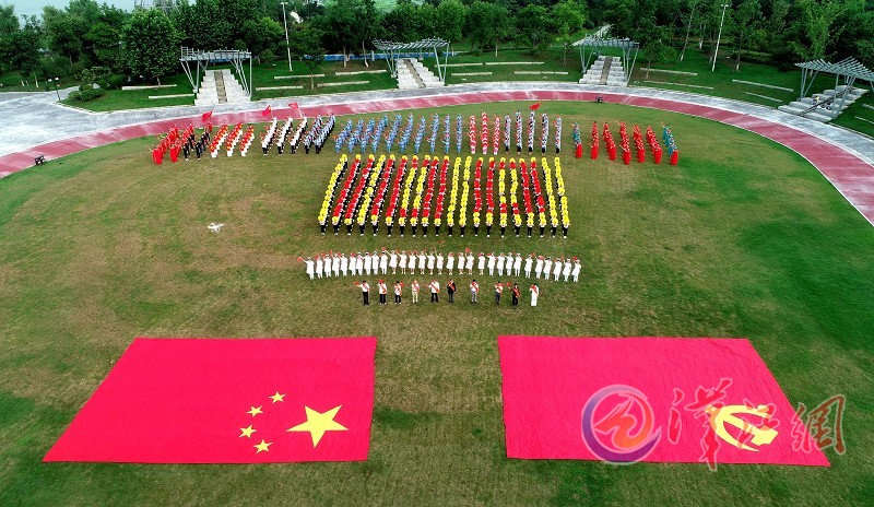 为隆重庆祝中国共产党成立100周年,进一步激发广大党员干部群众爱党、爱国热情,弘扬爱国主义精神,展示宜城党建工作的成果、经济社会发展的成就,该市举办了这次千余人参与的“快闪”活动。参与者有劳模、医护工作者、警察、中小学生等。