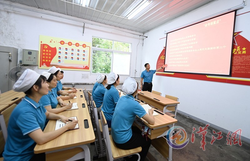 7月6日,在际华三五四二纺织有限公司整理车间,党支部书记李波带领大家学习习近平总书记在庆祝中国共产党成立100周年大会上的重要讲话精神。