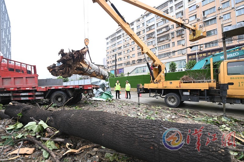 7月7日,市住建局绿化管理处园林工人将一棵倾倒的大树分段运走。