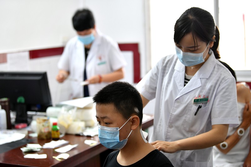 7月11日,在保康县城关镇卫生院,医护人员为一名儿童贴“三伏贴”。当日是入伏首日,市民来到医院接受冬病夏治,通过穴位艾灸、贴敷等达到治病、防病的效果。特约通讯员 杨韬 通讯员 吕莉莉 杭富平 摄
