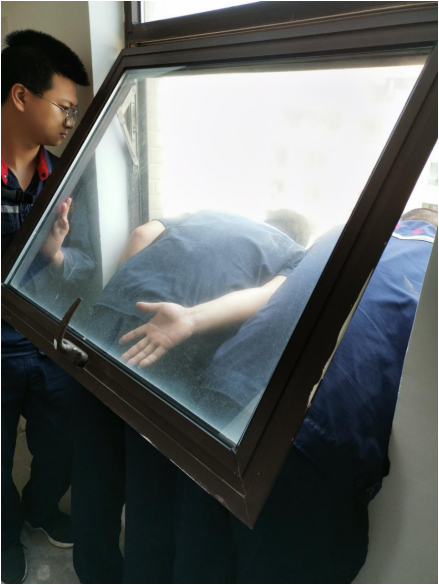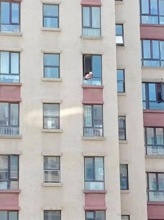 在对面楼层业主的帮助下很快确定了老奶奶在7号楼16层的一个小房间窗户边上,位置确定后,电梯维保席思锐和工程部的李季、王树忠等人快速上楼进行解救,客服祁庆燕和吕倩则在楼下继续喊话安抚。老人情绪渐渐稳定,上楼后施救人员从17楼步梯的窗户口与老奶奶取得联系,从老奶奶口中得知老奶奶到储藏室拿菜准备做饭,哪料储藏室门被风碰上,且门锁又是坏的,储藏室门里外都打不开,家里还躺着另一位患病的老人,老奶奶开不了门急得团团转,无奈之下,只得打开窗户呼救。