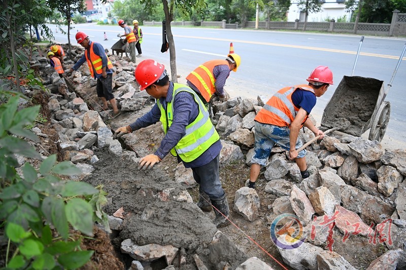 7月19日,襄城公路段施工人员在305省道尹集段修复水毁挡墙。前几日的暴雨造成全市国省道部分路段出现路面坍塌、附属设施损毁,市公路部门及时组织人员巡查并进行修复,确保交通安全。