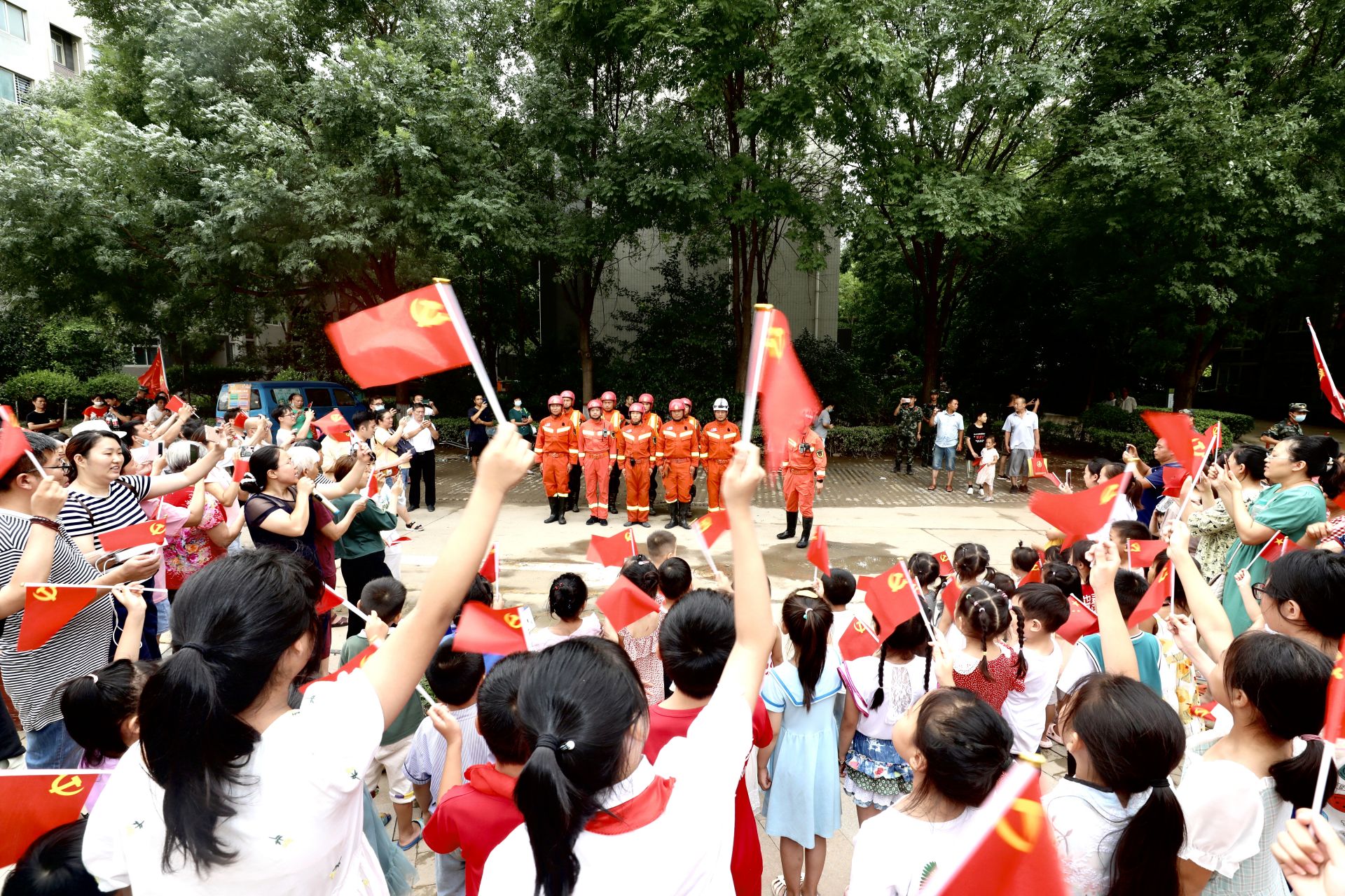 汉江网讯(全媒体记者吴肖 牛传宇 通讯员张旭)7月28日下午,郑州市郑东新区白沙镇郑东新世界小区广大业主自发带着孩子们集合在一起,向在此奋战了2天2夜的襄阳市消防救援支队指战员致敬,他们挥舞国旗齐声高唱《听我说谢谢您》,感谢他们不分昼夜帮助群众排涝。
