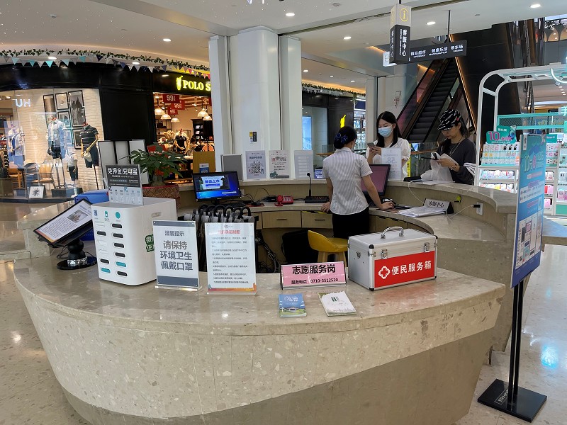 在该商场服务台,记者看到,志愿服务岗“五有”已配齐,且在显著位置摆放了文明创建、诚信建设等宣传折页。