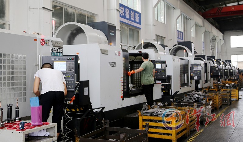 图为7月27日,谷城县东华机械股份有限公司的技术工人在智能生产车间操控机器作业。