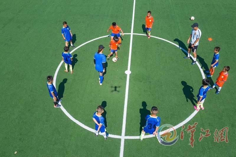 7月30日,在老河口市第二小学,武汉体育学院足球学院硕士研究生志愿者指导孩子们进行足球训练。暑假期间,武汉体育学院开展志愿者“三下乡”活动,8名硕士研究生志愿者来到老河口市的4所小学,参与校内暑期托管服务。