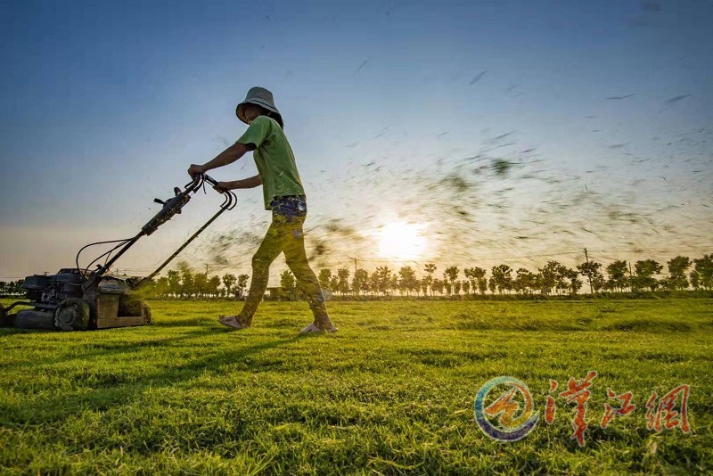 7月29日,农民在枣阳市百慕大草坪剪草、浇水。枣阳市杨垱镇孙岗村田长宝、王秋杰夫妇于2019年流转200亩土地种植草坪,成立“枣阳绿满华夏草坪基地”。3年来一年一大步,一茬接一茬的草坪供不应求,年创收100多万元。 通讯员 李明 摄