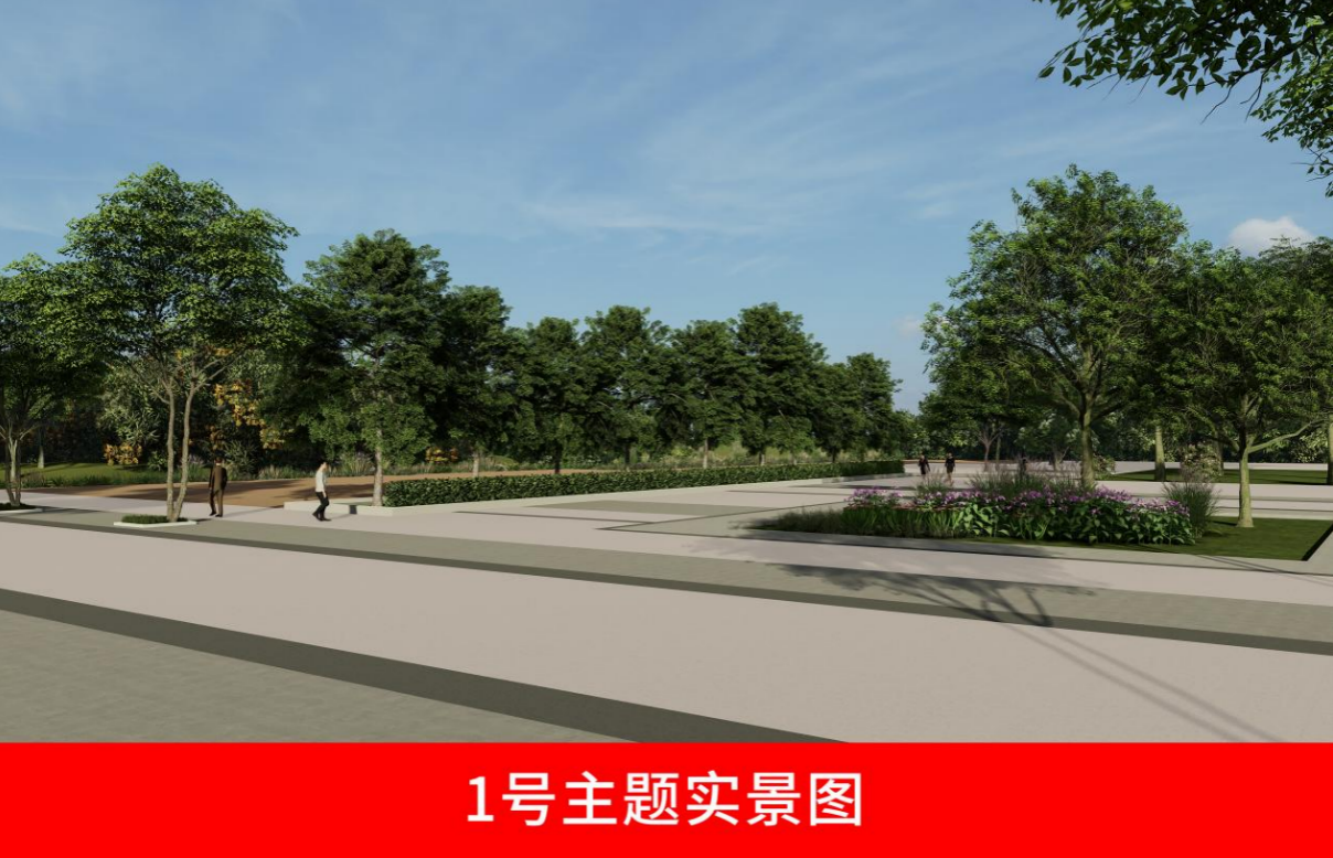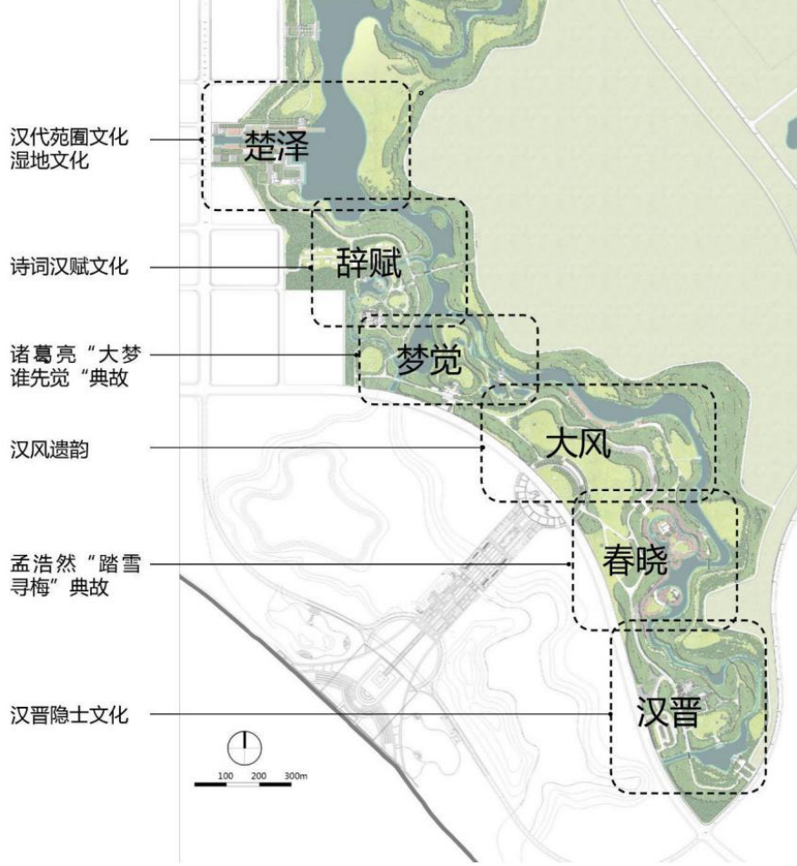 1、“楚泽园”。楚泽园位于浩然路东侧,是六大园区的主入口所在地。整个园区以水为界,分为南北两处区域。整体以简洁现代的直线造型,通过丰富的高差变化,空间转换和细节处理,层次错落,营造舒适的游赏空间。