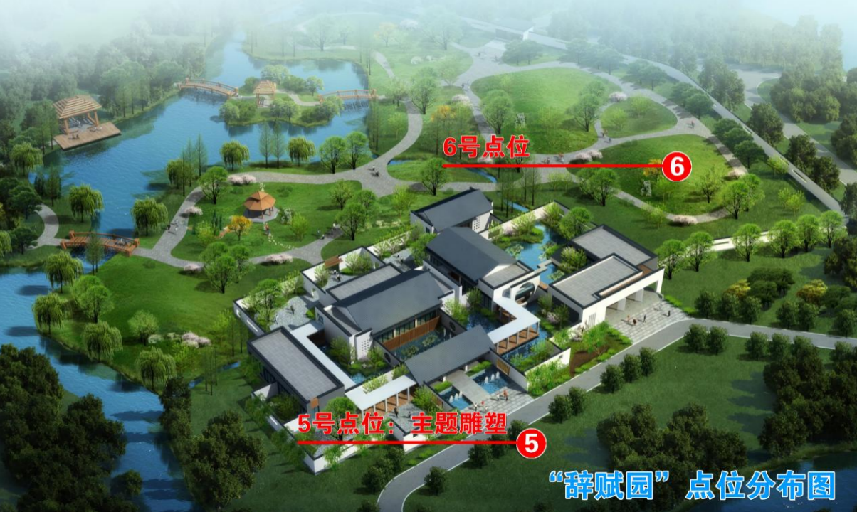 2、“辞赋园”。本园设计以汉风为基调,中式庭院的三级驿站融入汉赋诗词,形成一步一景,一园一诗的景观,随处可见丛丛竹林,园中设小盆景,与楚辞汉赋融合,增强中式园林的文化与艺术气氛。
